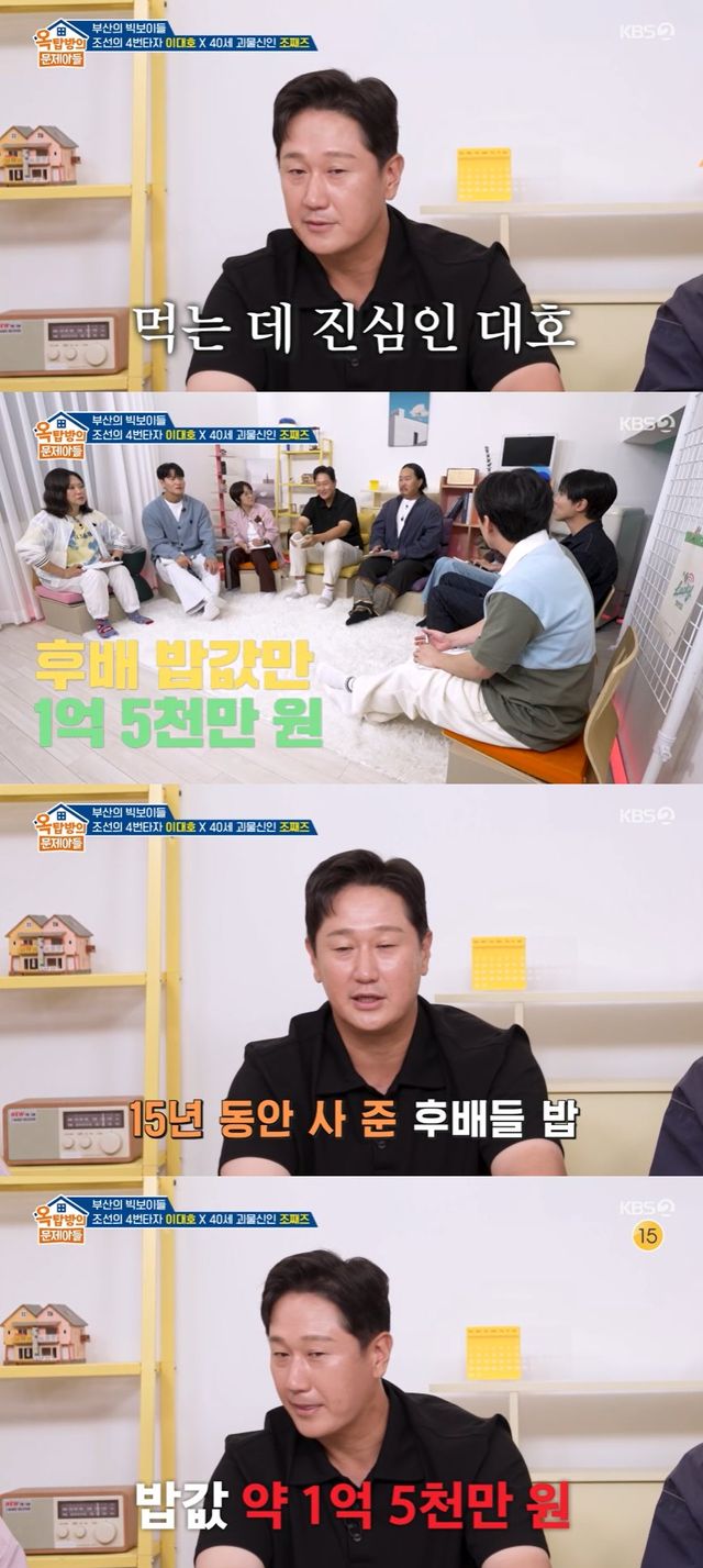 이어 이대호는 "어렸을 때 힘들게 자라왔고 저도 26살 때까지 연봉이 많지 않았는데 가끔 선배들이 밥 사주면 고마웠다. 선배들이 열심히 하라고 방망이 던져주면 너무 좋았다"라며 옛 기억을 떠올렸고, "너무 감사했는데 저도 어느 정도 돈을 벌다 보니까 돼지고기는 사 먹을 수 있는데 소고기는 후배들이 못 사 먹으니까 일부러 비싼 건 사준다"라고 덧붙였다.