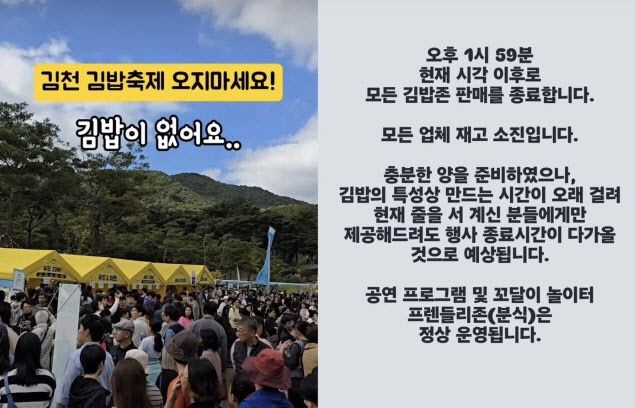 점차 달아오르는 열기에 김천시는 이번 행사에 총력을 기울일 방침이다. 앞서 지난 축제 당시 김천시는 1만 명분의 김밥을 준비했고, 생각한 것과는 달리 13만 명 이상이 몰리면서 김밥이 예상보다 빨리 소진되고 말았다. 행사를 찾은 이들은 “김밥 없는 김밥축제였다”, “김밥 먹으러 갔다가 컵라면만 먹었다”, “김밥은 없고 사람만 많았다”며 혹평을 쏟아냈다.