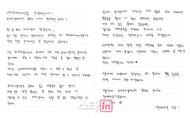 한해리준은 5일 다크비 공식 사회관계망서비스(SNS)를 통해 공개한 자필 편지에 “저를 끝까지 응원해주신 ‘스타 크리에이터’님들에게 감사하는 말씀을 드리고 싶다”고 적었다. 이어 그는 “참가 전 ‘잘할 수 있을까’라는 걱정을 많이 했는데, ‘스타 크리에이터’님들 덕분에 잘해낼 수 있었다”고 했다.