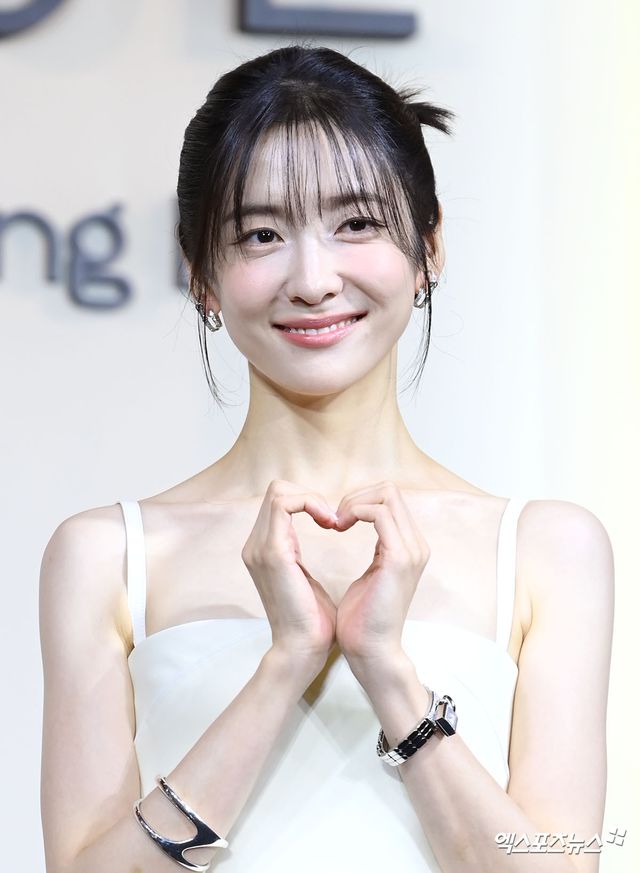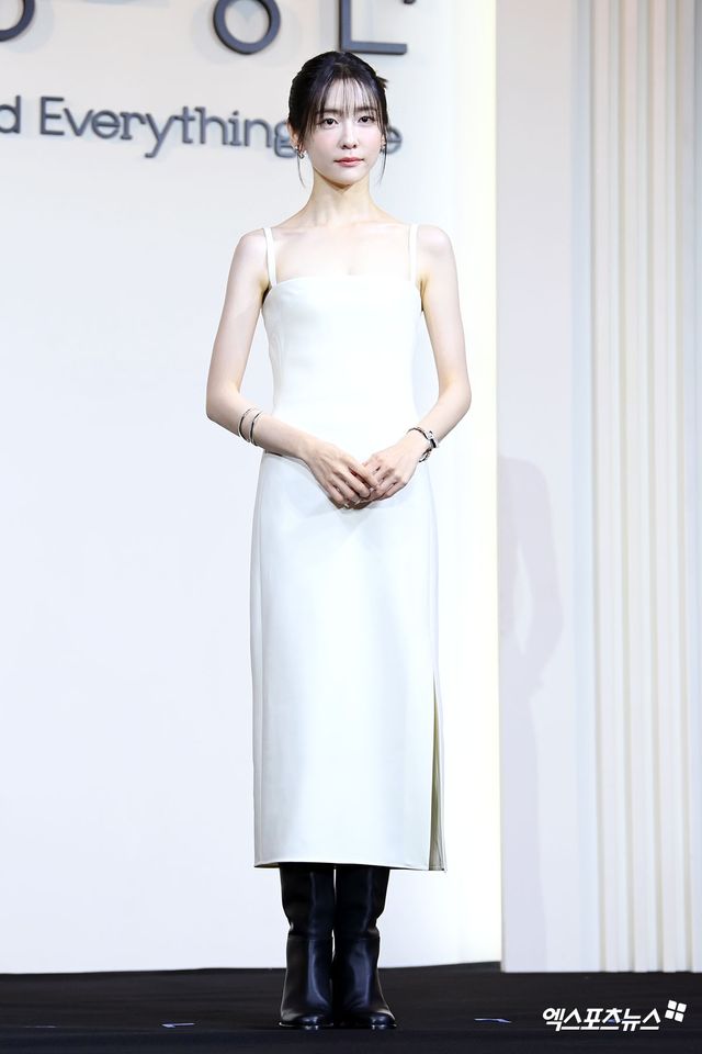 이날 박지현은 화이트 슬립 드레스와 블랙 롱부츠로 대조적인 무드를 완성했다. 미니멀한 드레스에 깊은 슬릿으로 우아함을 더했고, 투박한 롱부츠를 매치해 강렬한 느낌을 줬다. 깔끔하게 묶은 업스타일 헤어와 자연스럽게 내린 시스루 앞머리가 세련되면서도 사랑스러운 분위기를 자아냈다.