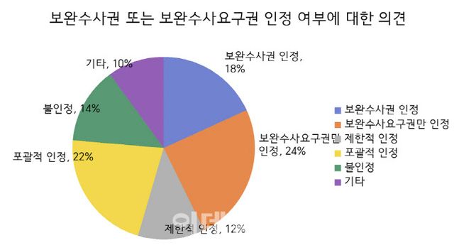 조사 결과에 따르면, 전체 응답자 76%(84명)가 검찰에 보완수사권 또는 보완수사요구권을 부여해야 한다고 답했다. 보완수사권과 보완수사요구권 모두를 인정하지 않아야 한다는 응답률은 14%(15명)에 그쳤다. 보완수사권은 경찰의 수사 결과를 검찰이 검토한 후 추가 조사가 필요하다고 판단해 추가 수사를 요구하는 권한이다.