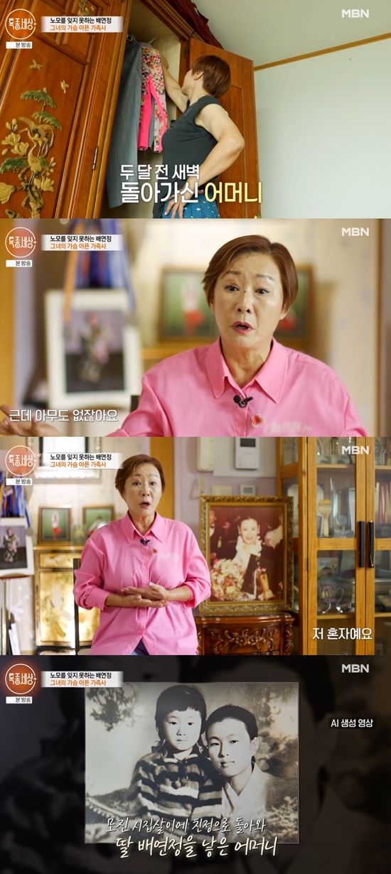 돌아가신 배연정의 모친은 모진 시집살이에 배연정을 임신한 채 친정으로 도망 왔다고. 배연정은 아버지의 존재를 모른 채 타지에서 일하는 어머니를 늘 그리워하며 자랐다. 그래서 그는 19살 돈을 벌기 시작하자마자 어머니와 살기 시작해 55년간 함께했다.