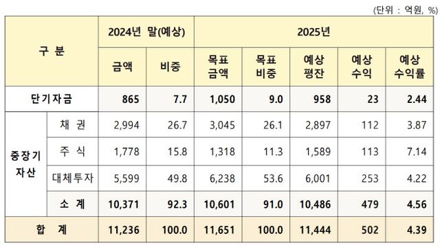 공제회의 올해 전체자산 목표 수익률(4.02%)은 세부적으로 △단기자금 2.70% △중장기자산 4.12%로 구성된다.
