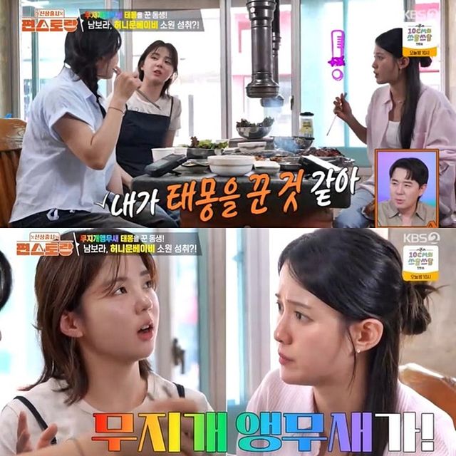동생은 “원래 꿈을 잘 안 꾸는데 무지개 앵무새 열댓 마리가 나한테 슝 날아왔다. 전설에나 나올 법한 장면이었다”고 구체적으로 설명했다. 이에 남보라는 수줍게 웃으며 “그건 네 태몽 아니야?”라고 반응했다. 하지만 곧 “앵무새가 15마리면 열다섯 남매 아니냐”는 말에 “엄마를 뛰어넘는 거냐”며 놀라움을 감추지 못했다.