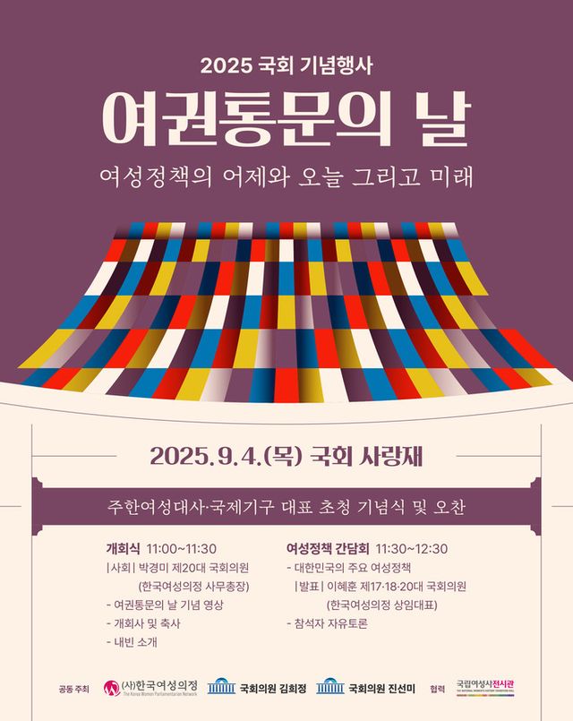 작년에 이어 두 번째로 「여권통문의 날 국회 기념행사」를 개최하고 있는 이혜훈 한국여성의정 상임대표는 “2025년은 여권통문 선언 127주년, 호주제 폐지 20주년이 되는 해이자 북경행동강령 발표 30주년이 되는 의미 있는 해이다. 여성권익 증진 뿐만 아니라 대한민국 성장을 위해 여성참여를 대폭 확대하고 다양한 시각에서 양성평등 입법과제를 모색해 보고자 한다.”면서 “한국여성의정은 여야를 떠나 여성 국회의원, 각국의 여성 정치인들이 교류하고 정책적 협의를 할 수 있는 자리를 지속적으로 마련해 나갈 것”이라고 밝혔다.