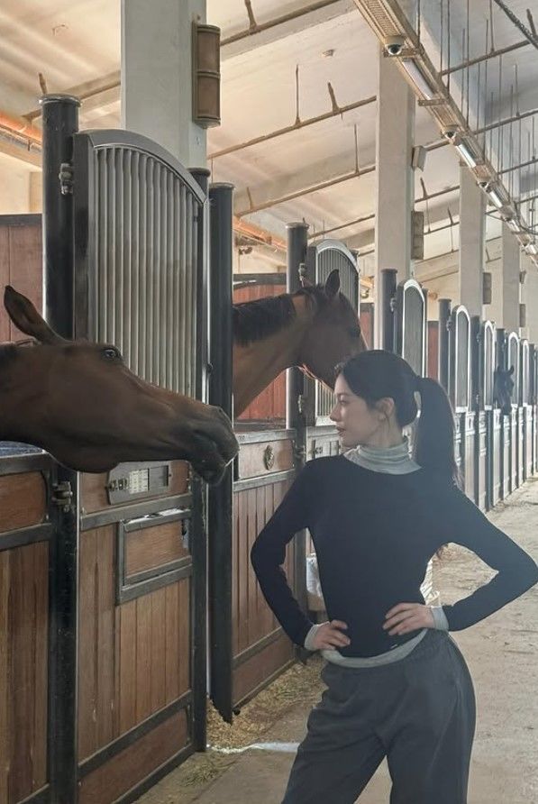포니테일 헤어스타일로 말과 마주 보며 포즈를 취해 시크한 매력을 드러냈다.