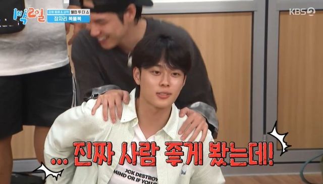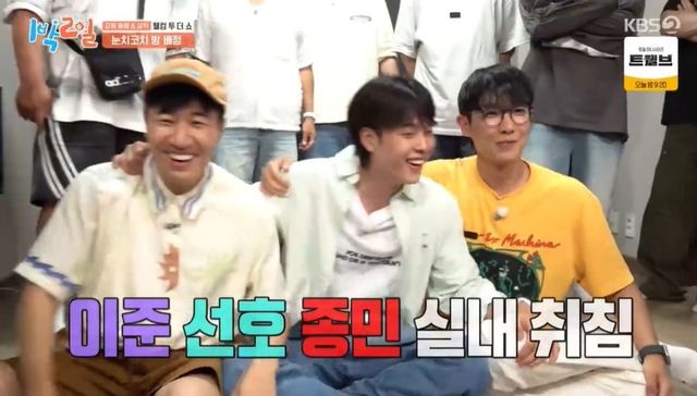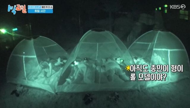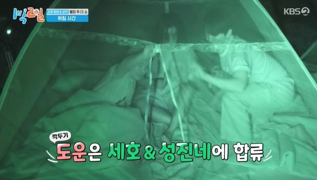 김종민은 도운에게 떨어져야 한다고 말하며 서로 다른 방을 선택했다. 선택 결과 오른쪽 4인실에 성진&조세호에 이어 도운, 원필&딘딘, 영케이&문세윤까지 7명이나 들어갔고, 김종민, 유선호, 이준만 실내 취침이 확정됐다. 김종민은 “도운이 잘 보냈다”라며 웃었다. 성진은 “‘1박 2일’ 나왔는데, 야외 취침 한 번 해야죠”라고 긍정적인 모습을 보였다.