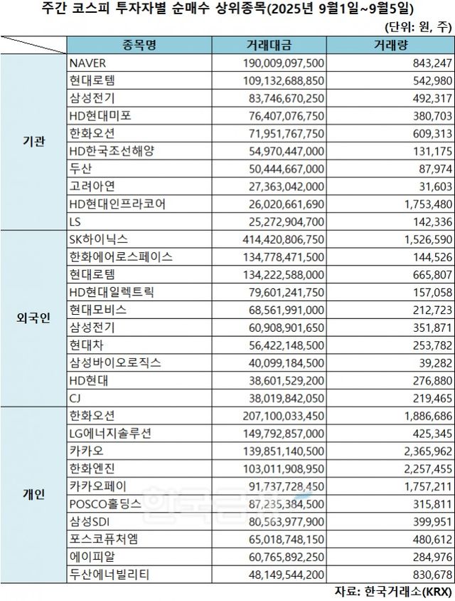 기관 'NAVER'·외인 'SK하이닉스'·개인 '한화오션' 1위 [주간 코스피 순매수- 2025년 9월1일~9월5일]
