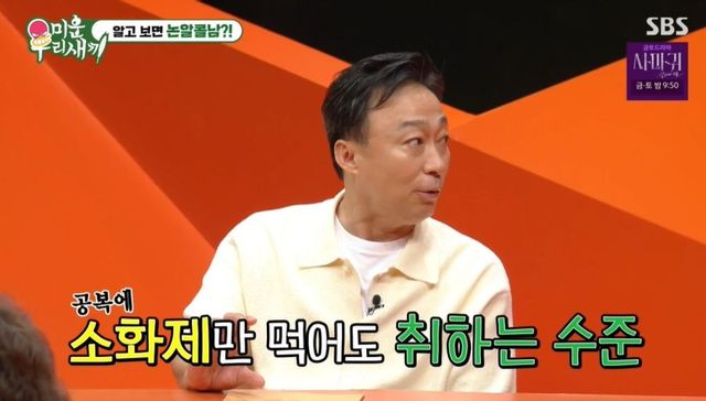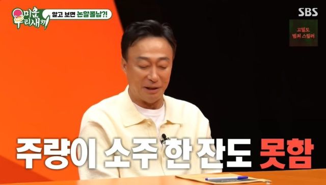 이어 이성민은 “어느 정도냐면 공복에 소화제만 먹어도 취하는 수준이다. 영화 ‘공작’ 찍을 때 촬영 끝나고 방에서 와인을 마셨다. 종이컵 1/3잔 마셨는데 방까지 비틀거리면서 왔다”라고 털어놓았다. 서장훈이 “사모님은 좋아하지 않냐. 늦게 안 들어갈 테니까”란 질문에 “그렇진 않다. 늦게 들어간다”라고 답해 웃음을 안겼다.
