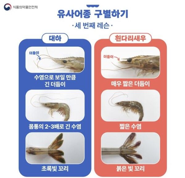 피해를 예방하기 위해서는 유사어종을 구별하는 것이 중요하다. 우선 곧 제철을 맞는 대하를 흰다리새우로 오인하는 경우가 많다. 식약처는 "대하의 경우 수염으로 보일 만큼 긴 더듬이가 있고, 몸톰의 2~3배로 긴 수염이 있다"라며 "초록빛 꼬리를 갖고 있다"라고 설명했다. 반면 흰다리새우의 경우 매우 짧은 더듬이, 짧은 수염, 붉은 빛 꼬리를 갖고 있다.
