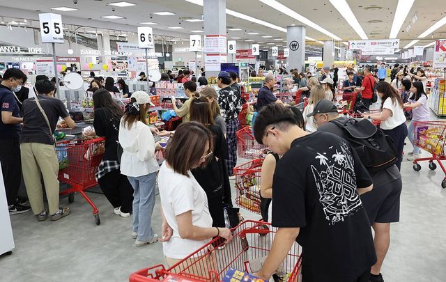 서울의 한 대형마트에 외국인 관광객들이 K-푸드 쇼핑을 마친뒤 계산대 앞에 줄지어 대기하고 있다 / 뉴스1
