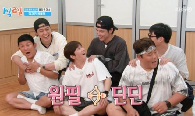 저녁 식사를 마친 ‘1박 2일’ 팀과 데이식스는 2명씩 짝을 지어 잠자리 복불복에 나섰다. 김종민-도운, 문세윤-영케이, 조세호-성진, 딘딘-원필, 이준-유선호가 각각 같은 팀으로 게임을 진행했다.