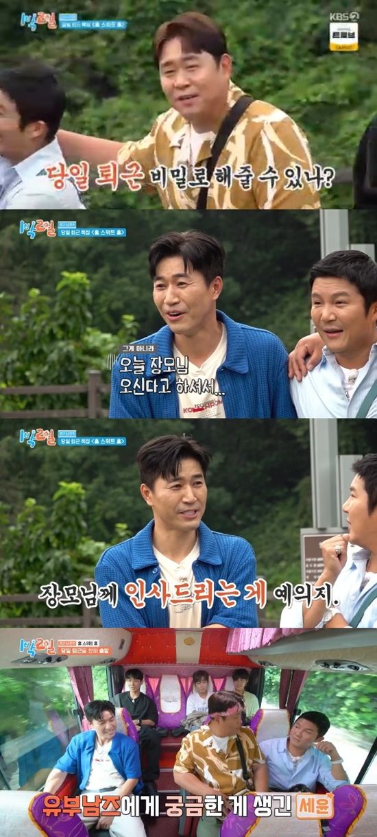 김종민은 그래도 장모님을 뵙기는 해야 한다면서 미혼 멤버들에게 그냥 당일 퇴근권을 내줄 수는 없다고 했다.