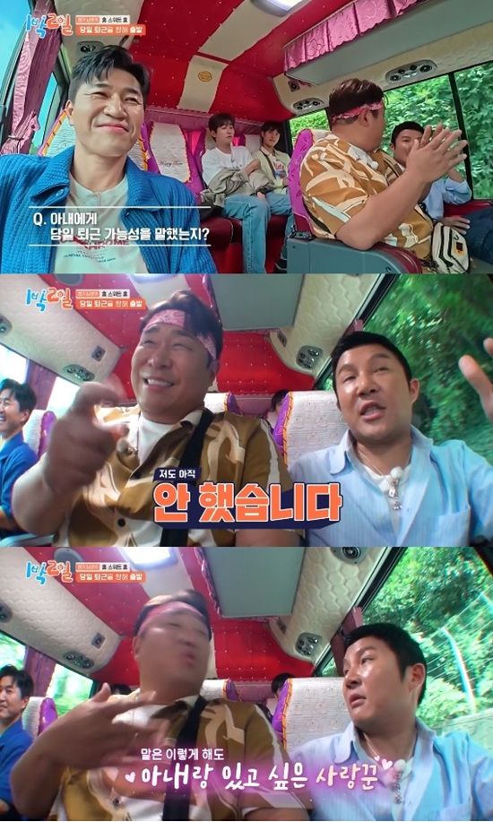 문세윤은 다음 장소로 이동하는 버스 안에서 김종민과 조세호에게 아내들한테 당일 퇴근 가능성을 말했는지 물어봤다.