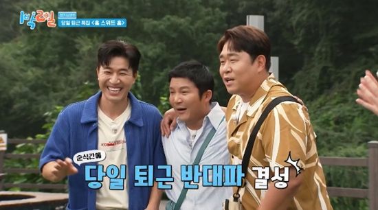 김종민은 당일 퇴근이 안 될 것 같다고 했다. 조세호 역시 "나온 김에 하루 자고 가자"고 말했고 문세윤도 동참하면서 당일 퇴근 반대파가 결성됐다.