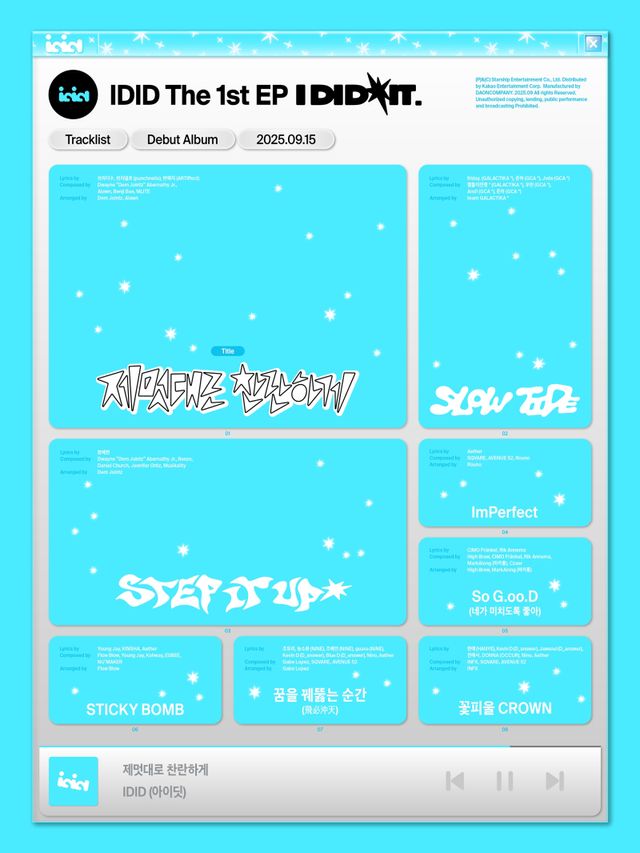 스타쉽은 지난 7일 아이딧(IDID) 첫 번째 미니 앨범 ‘아이 디드 잇.’의 트랙 리스트를 공개했다. 아이스 블루 무드의 스킨으로 이뤄진 트랙리스트는 음악 재생 프로그램의 팝업창 느낌으로 하이틴 감성을 채워 아이딧만의 청량미를 완성했다.
