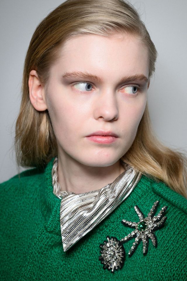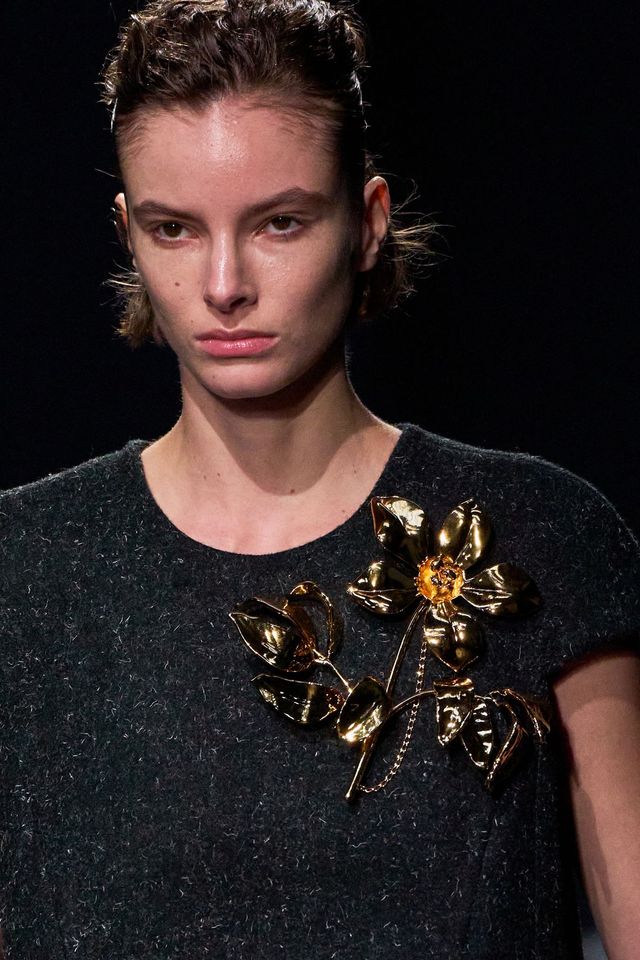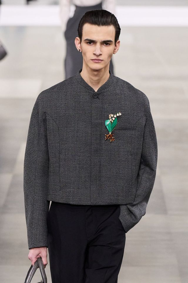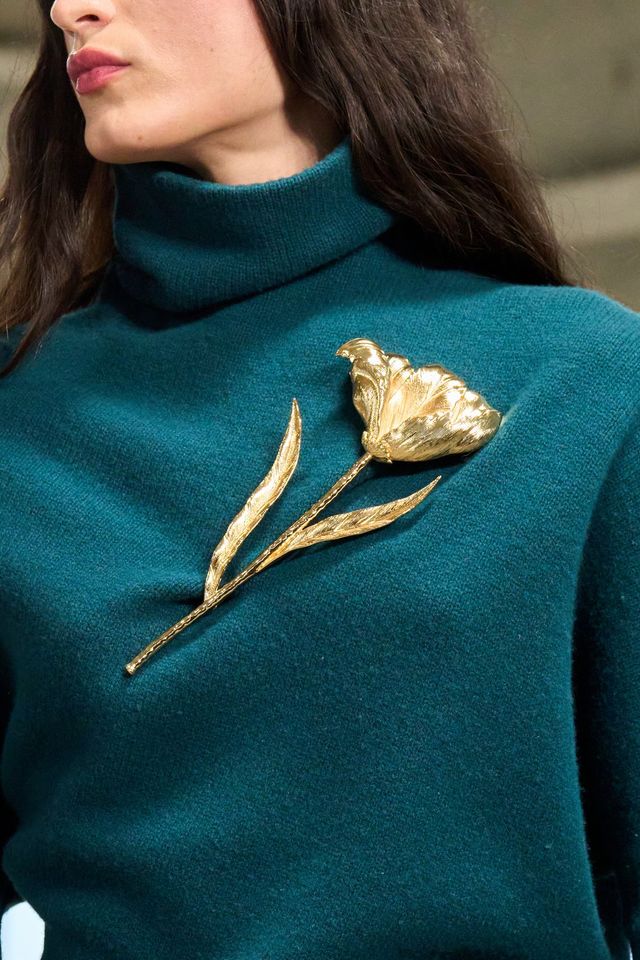 먼저, 페미닌에 대한 고찰을 담은 컬렉션을 선보인 미우미우가 가장 돋보인다. 카디건과 퍼 스톨은 물론 가죽과 니트웨어 위 큼지막한 골드 브로치를 매치해 소녀적 감성과 성숙한 우아함 사이의 긴장을 만들었다. 정교한 테일러링에 해체주의적 유머를 더한 쇼를 선보인 모스키노는 어땠을까? 모노톤의 심플한 미니드레스에 얼굴만한 크기의 플라워 모티프 브로치로 룩의 분위기를 단숨에 반전시켰다. 우아함의 대명사 카롤리나 헤레라는 컬렉션을 관통하는 모티프인 튤립을 메탈릭한 브로치로 재해석했는데 장기인 니트 드레스뿐만 아니라 테일러드 재킷 위에도 브로치를 얹으며 룩에 품격을 불어넣었다. 토리 버치는 매들린 올브라이트의 ‘브로치 외교’에서 영감을 얻은 플로럴 브로치를 제안하며 스포츠웨어와 드레스업을 자유롭게 넘나들었고, 디올 맨 쇼에도 화려한 브로치가 등장하면서 브로치가 여성만을 위한 주얼리가 아닌 남녀 모두가 즐길 수 있는 액세서리임을 증명했다.