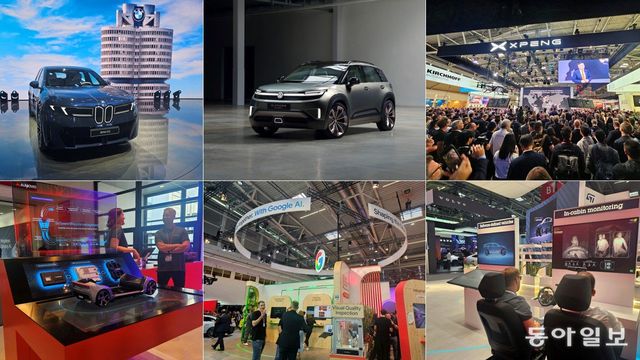 8일 독일 뮌헨 메쎄에서 열린 IAA 프레스데이 현장에서 기업들이 차세대 전기차 모델을 선보였다. 왼쪽 위 시계방향으로 BMW는 ‘노이어 클라세’ 플랫폼 기반 뉴 iX3를 세계 최초로 공개했고, 폭스바겐은 2026년 양산 예정인 컴팩트 전기 스포츠유틸리티차량(SUV) ‘ID.크로스 콘셉트’를 처음 선보였다. 중국 업체 샤오펑(XPENG) 부스에는 수많은 외신 기자와 자동차 관계자들이 몰렸다. 이번 IAA에는 2023년 대비 40% 더 많은 중국 업체가 참가해 ‘유럽 대 중국’ 대결 구도를 형성했다. 구글 AI 부스와 소프트웨어 정의 차량(SDV) 시연 현장에서는 방문객들이 인공지능·자율주행 등 미래 모빌리티 핵심 기술을 직접 체험할 수 있었다. 뮌헨=김재형 기자 monami@donga.com
