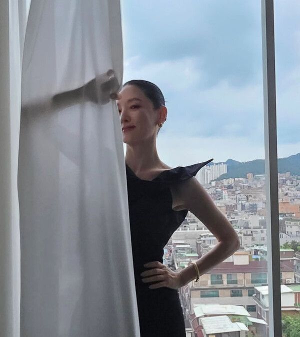 사진 속 이영애는 커튼 뒤에서 포즈를 취하고 있다.