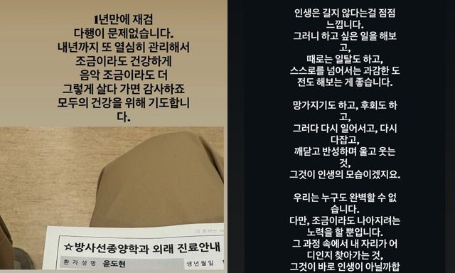 윤도현은 지난 8일 자신의 계정에 “1년 만에 재검. 다행히 문제없다”라는 글과 사진을 올렸다.