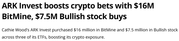 미국 아크인베스트먼트(Ark Investment) 자산운용사가 가상화폐 관련 주식 종목 투자를 확대하고 있다는 소식이다. 최근 아크인베스트먼트가 매수한 가상화폐 관련 종목으로는 비트마인이머전(BitMine Immersion)과 불리시(Bullish)가 있는 것으로 확인됐다.