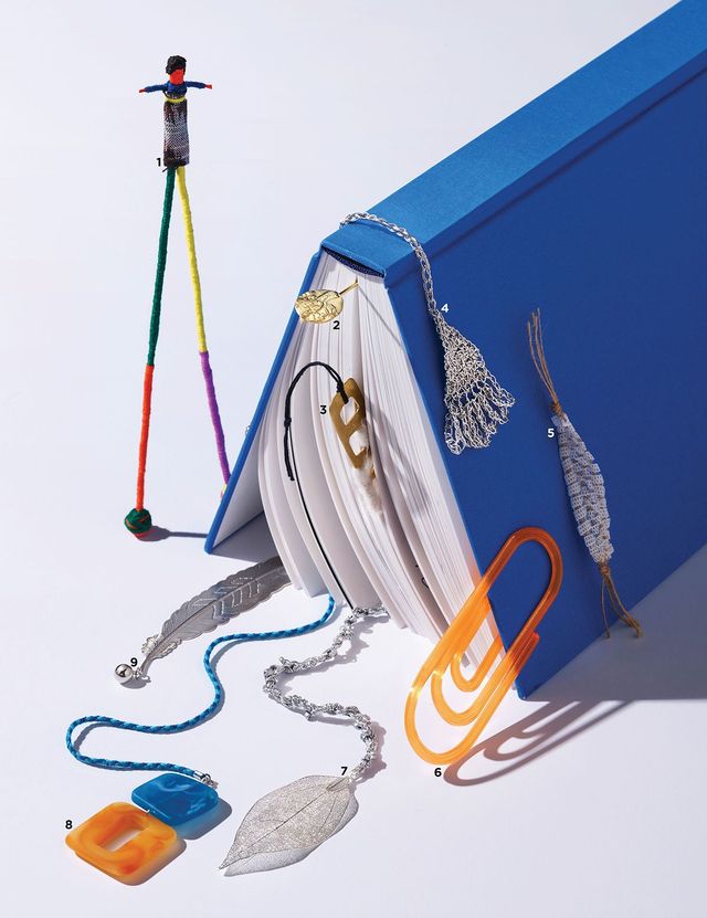1 근심을 없애준다는 과테말라 전설 속 걱정인형을 모티프로 한 북마크는 1만7천원 39etc. 2 시간이 지날수록 지문이나 마찰로 자연스러운 손때를 입는 황동 소재 북마크는 1만5천원 De Moon. 3 금속 오브제에 얇은 털실을 엮어 키링으로도 활용할 수 있는 북마크는 3만5천원 Ruth Atelier × Sonnette. 4 꽃봉오리 모양의 크로셰 북마크는 2만원 Ruth Atelier. 5 마사를 비롯한 여러 가지 색실을 엮어 만든 북마크는 5천원 Monthday. 6 재사용 가능한 플라스틱을 3D 프린팅해 만든 클립 모양의 북마크는 5천원대 The Completist. 7, 9 실제 잎사귀를 메탈 소재로 본떠 만든 북마크는 3만원, 깃털 모티프 실버 북마크는 1만9천원 D.pablo. 8 컬러풀한 원석을 끈과 연결해 길게 늘어뜨린 북테일은 1만7천원대 Twiner.