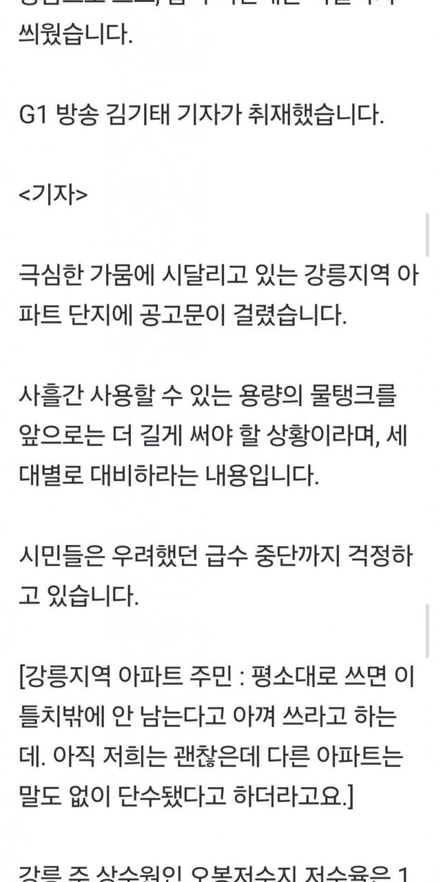 〈앵커〉가뭄으로 재난사태가 선포된 지 열흘째인 강릉에선 한 달 안에 저수율이 5%까지 떨어질 수 있다는 어두운 전망까지 나오고 있습니다. 시민들은 물 한방울이라도 아끼기 위해, 식사에 필요한 모든 도구는 일회용품으로 쓰고, 급식 식판에는 비닐까지 씌웠습니다.G1 방송 김기태 기자가...