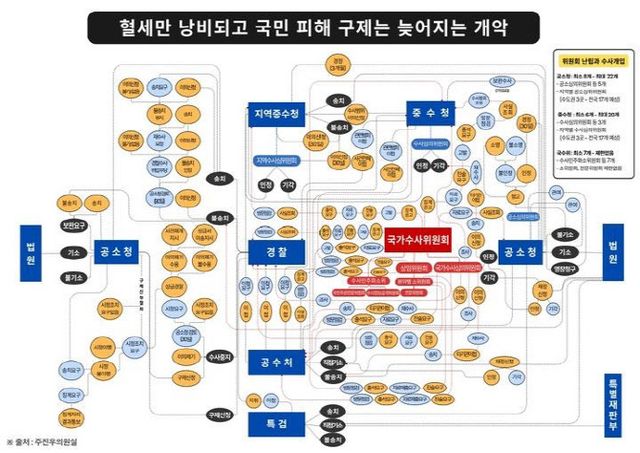 주 의원은 “민주당 안대로 검찰청을 없애고, 공소청, 국가수사위원회, 중대범죄수사청을 신설하면 얼마나 복잡해질까”라며 직접 제작한 사건 흐름도를 함께 공유했다.