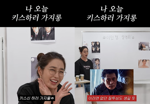 영상 속 왕빛나는 이민정에게 "너 키스신 촬영 날 혹시 (남편한테) 말하고 나가냐"고 물었고 이민정은 어이없다는 듯 웃으며 "굳이 말을"이라고 했다.