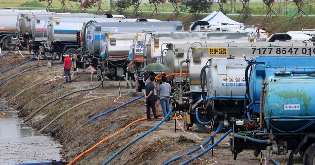 강원 강릉의 한 하천에서 살수차들이 운반급수를 위해 줄지어 취수하고 있다. / 연합뉴스