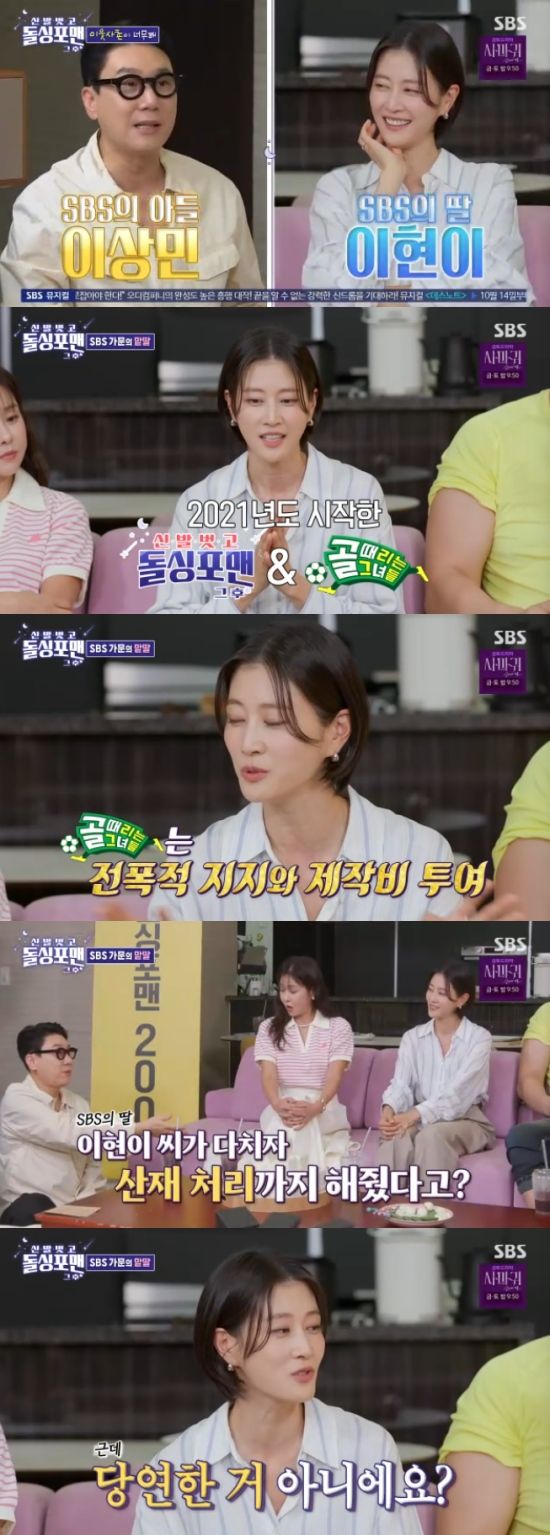 이상민은 "이현이 씨가 SBS의 딸이라서 '골때녀'에서 다친 걸 선재처리 해줬다고 하더라"고 했고, 이현이는 "당연한 거 아니냐. 촬영하다 다쳤는데. 그리고 그건 SBS 딸이라서가 아니라 '골때녀' 출연진이 다치면 전부 산재처리를 해준다"고 전했다.