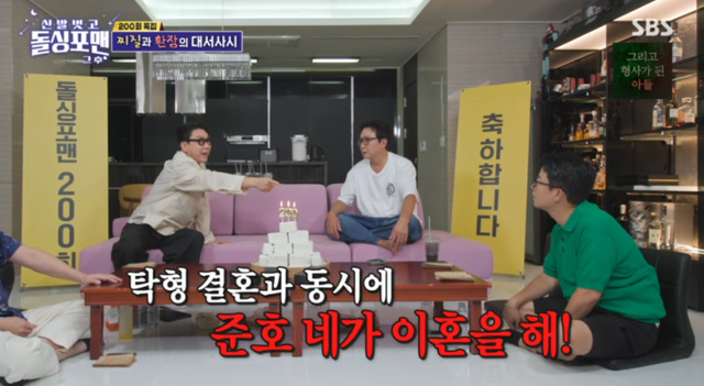 황당해진 김준호가 “형이 먼저 결혼했으니 형이 먼저 이혼해야 한다”고 맞받아치자, 탁재훈은 “프로그램을 위해서라면 도와야 한다”고 거들었다.