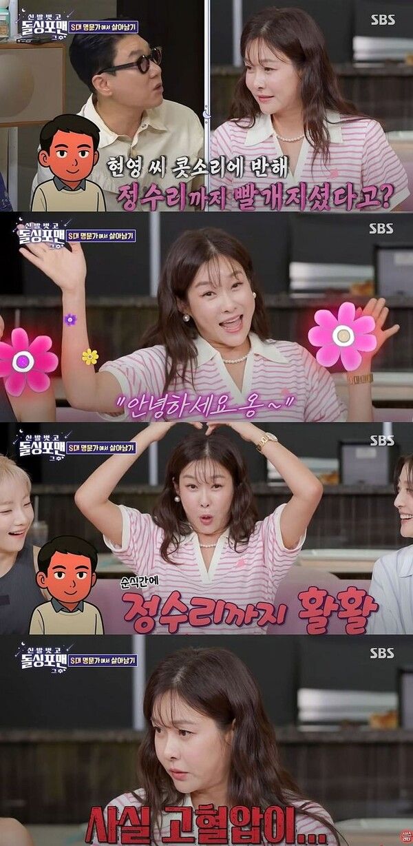 앞서 이상민이 "남편이 현영 씨 콧소리에 반해 정수리까지 빨개졌다고 하더라"라고 했다.