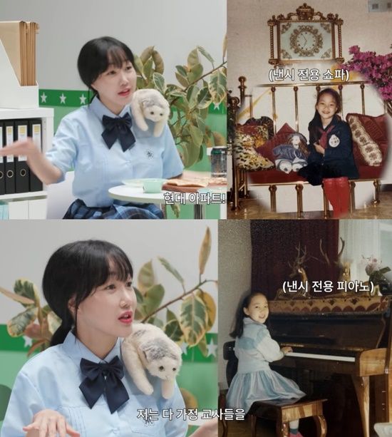 공주 같은 의상과 고풍스러운 집안 인테리어까지, 사진으로만 봐도 부유해보이는 모습에 낸시랭은 "제가 어릴 때는 과목마다 가정교사가 있었다"고 전했고, "사진으로만 봐도 사랑 받은 것이 느껴진다"는 웬디의 말에 "저는 초등학생 시절이 너무 행복했다"고 얘기했다.