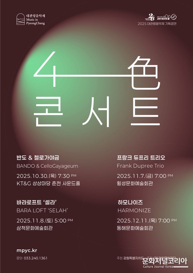 한편 4色 콘서트는 9월 11일(목) 오후 2시 대관령음악제 누리집(mpyc.kr/tickets)과 NOL 티켓(nol.interpark.com)에서 티켓 판매 예정이다. 가격은 전석 3만원으로 얼리버드 30% 할인(9.11.~9.28.까지), 강원도민, 초․중․고․대학생, 장애인 및 국가유공자 50% 할인(1인 2매) 등 다양한 할인 혜택이 있으며, 관련 문의는 평창대관령음악제운영실(033-240-1361)로 하면 된다.