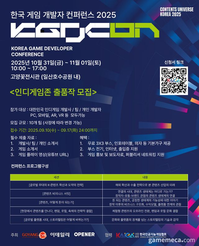 한국인공지능게임협회는 오는 10월 31일부터 11월 1일까지 경기도 고양꽃전시관에서 열리는 2025 콘텐츠 유니버스 코리아에 인디게임존 전시 출품작을 모집한다.