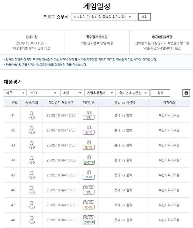 이번 프로토 승부식 107회차에서 롯데-한화전을 대상으로 하는 경기는 ▲일반(41번) ▲승1패(42번) ▲핸디캡(43번) ▲언더오버(44번) ▲SUM(45번) ▲전반 일반(46번) ▲전반 핸디캡(47번) ▲전반 언더오버(48번) 등의 다양한 유형으로 즐길 수 있다.