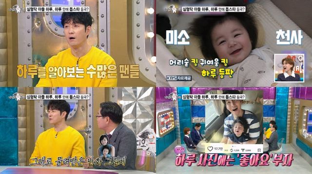 풍성한 머리숱만큼 귀여움이 폭발하는 하루의 모습이 공개되자, MC 김구라는 “‘미래소년 코난’의 포비 같아요”라며 눈을 떼지 못했다. 방긋 웃는 하루의 미소에 심형탁은 “진짜 잘 웃어요”라며 ‘아빠 미소’를 지었다. 엄마의 미모를 그대로 물려받은 하루의 귀여운 모습에 칭찬이 쏟아졌다.