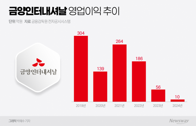 10일 금융감독원 전자공시시스템에 따르면 금양인터내셔날은 2024년 매출 1063억원, 영업이익 9억8904만원을 기록했다. 전년 대비 매출은 11.4% 감소했고 영업이익은 82.4%나 줄었다. 2023년 영업이익이 56억1669만원이었던 점을 감안하면 불과 1년 새 수익 구조가 급격히 흔들린 것이다. 지난해에는 당기순이익도 적자로 전환됐다.