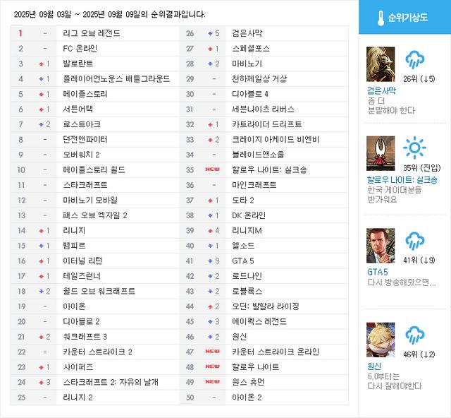 하위권에서는 GTA 5가 9계단 하락해 41위를 기록했다. GTA 5의 경우 순위변동에 개인방송 시청 수가 직접적인 영향을 미친 것으로 보인다. 8월 2주차부터 4주차까지 개인방송 시청 수가 크게 늘었고, 이번 주에는 대폭 하락했다. 그리고 SOOP 스트리머 ‘화양씨’가 지난 8월 16일부터 30일까지 GTA 인터넷 방송인 서버를 운영했다. GTA 5의 순위상승과 하락 시점이 방송시기와 맞물린다. 여기에 경쟁이 치열한 상위권에 비해 수치 변화에 따른 순위 변동폭도 큰 것으로 분석된다.