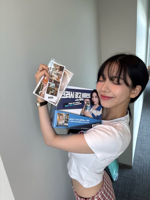 지난 9일 카리나는 자신의 SNS에 광고 촬영 비하인드 패키지와 4컷 사진을 들고 있는 사진 여러 장을 게재했다.