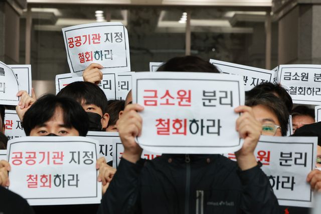 금융감독원 노동조합원과 직원들이 지난 9일 서울 영등포구 여의도 금감원 로비에서 금감원을 공공기관으로 지정하고 금감원에서 금융소비자보호원을 분리하는 정부조직 개편안을 규탄하고 있다. ⓒ 연합뉴스