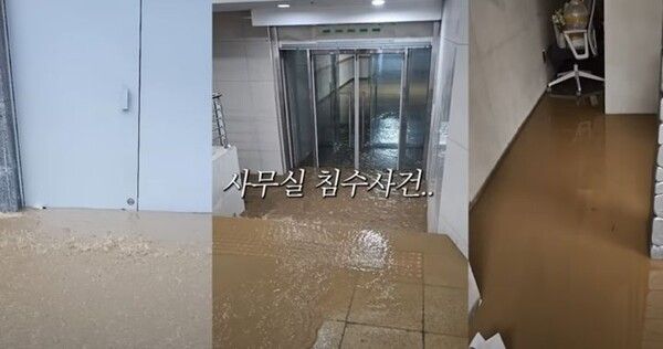 공개한 당시 사무실 현장 영상에는 발까지 차오른 흙탕물 속에 잠긴 다량의 화장품과 내부 직원들이 전자레인지, 컴퓨터 등 전자기기를 보호하며 수습하는 모습이 담겼다.