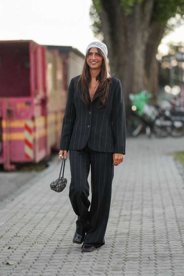 포멀함의 대명사인 스트라이프 수트에 화이트 헤어 스카프 하나만 더하면 분위기가 완전히 달라집니다. 바람에 흩날리는 스카프가 단정한 스트라이프에 자유로움을 불어넣고, 손바닥만 한 미니 백이 경쾌한 리듬을 더하죠. 매니시함을 유연하게 풀어낸 조합은 오직 스트리트에서만 가능한 해방감을 완성합니다.