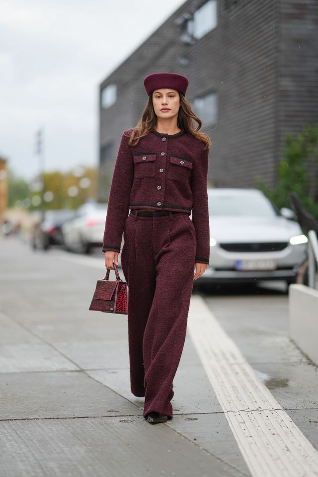 트위드는 어떤 컬러를 매치하는지에 따라 분위기가 완전히 달라지는 소재입니다. 깊은 색감의 버건디 수트 셋업에 베레모와 토트백까지 톤온톤으로 맞추니, 고급스럽고 여성적인 무드가 극대화되죠. 클래식에 머물던 트위드가 우아하면서도 당당한 존재감으로 다시 태어나는 순간입니다.
