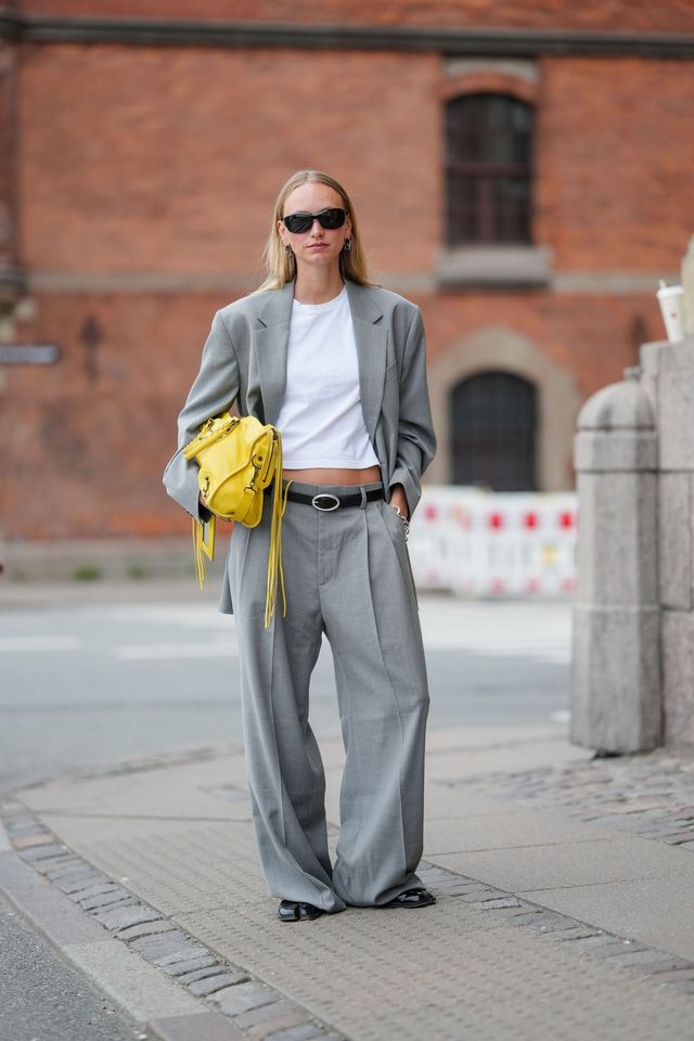 차분한 그레이 수트도 화이트 티셔츠 하나면 캐주얼한 숨통이 트입니다. 와이드 팬츠로 여유를, 블랙 슈즈로 안정감을 준 뒤 옐로 백을 포인트로 더하자 전체 룩이 단숨에 환해졌죠. 무겁게만 느껴지던 그레이가 가을 햇살처럼 생동감 있게 살아납니다.