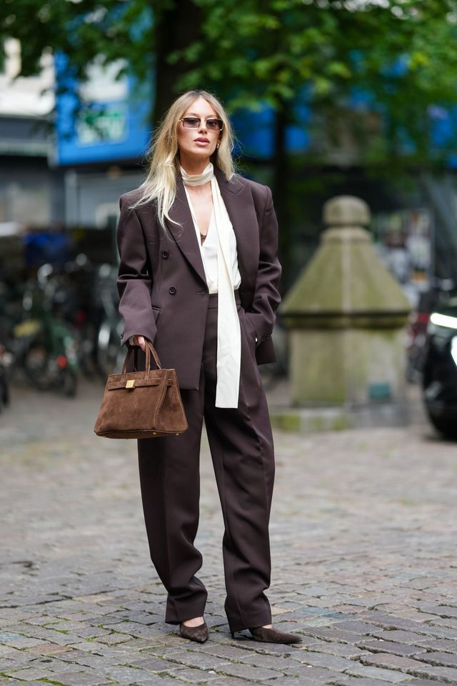 브라운 수트 셋업은 화이트와 아이보리 톤을 만났을 때 진가를 발휘합니다. 다크 브라운 수트 위에 아이보리 블라우스를 길게 늘어뜨려 매치하면 부드럽지만 단단한 무드가 완성되죠. 초커처럼 연출한 스카프가 견고한 수트에 은은한 흐름을 더하며, 여유 있는 리듬감을 선사하는군요.