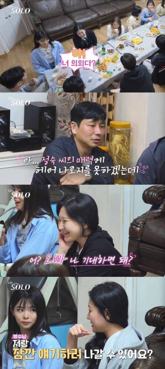 지난 10일 방송된 ENA·SBS플러스 '나는 솔로'에서는 돌싱남녀들의 첫날밤 이야기가 공개됐다. 이날 저녁 식사 자리에서 영수는 술자리를 리드하며 분위기를 띄웠고, 정숙은 평소 주량인 소주 10잔을 훌쩍 넘기며 만취했다.