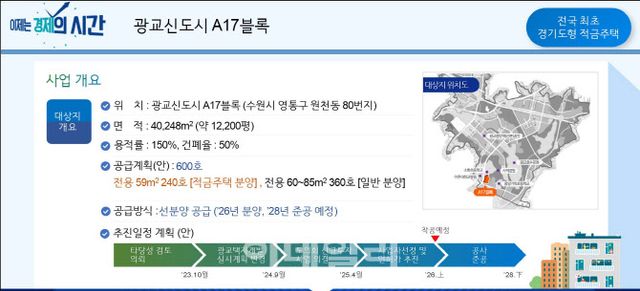 현재 GH는 광교A17블록에 전용면적 59㎡(25평형) 240세대 규모 적금주택 시범사업을 추진중이다. 2025년 4월 경기도의회에서 신규투자 승인을 받았으며 사업자 평가를 거쳐 9월 중 민간사업자를 선정하게 된다. 이후 2026년 상반기 착공 예정으로 준공 목표는 2028년 하반기다.