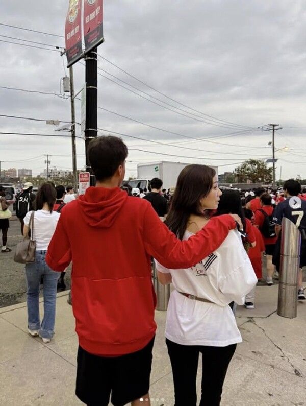 공개된 사진 속에는 손태영이 빨간 후드 티셔츠를 입은 장신의 남성과 나란히 걷는 모습이 담겨있다. 이 남성은 손태영의 아들 룩희 군으로, 엄마의 어깨를 감싸 안으며 듬직하고 다정한 매력을 뽐냈다.